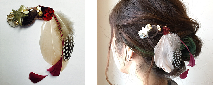 秋らしいカラーを使い、モールドで作成したジュエリーパーツと星を重ね合わせて、フェザーを女性らしくみえるよう歩くと揺れるようにあしらいました。